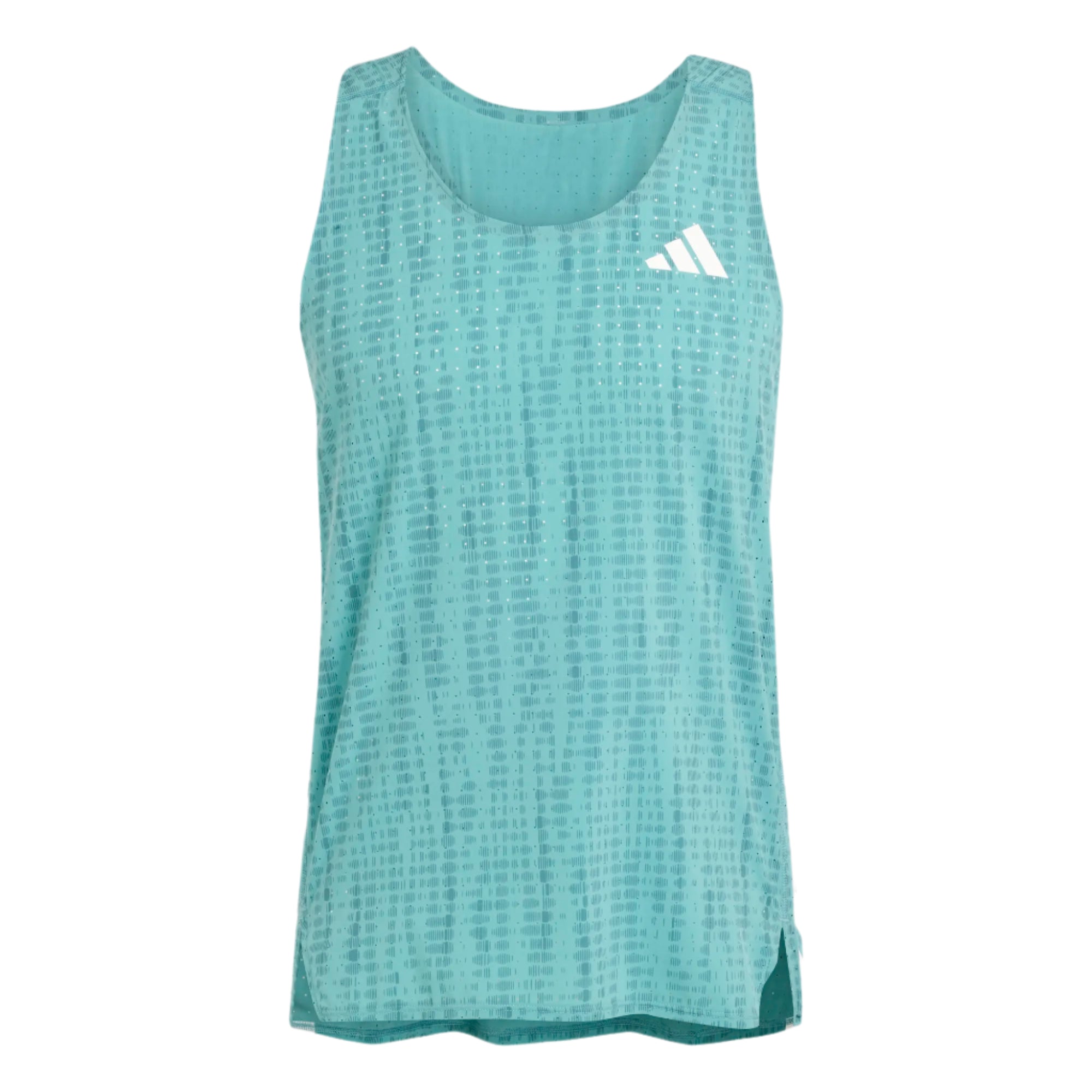 Built for speed and freedom, this ultralight running singlet from adidas is designed to help you get to the finish line. The slim fit and staggered side seams reduce chafing and provide a nearly imperceptible feel, even over the longest distances. Strategic perforations ensure optimal ventilation, while edge bands at abrasion points minimize irritation. Ideal for both competitive races and hot training days where every gram counts. Made with at least 70% recycled materials to reduce waste and environmental impact. A singlet created for you who are chasing the next breakthrough.